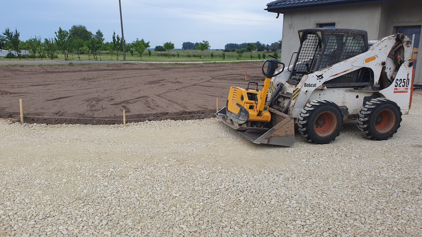 Kiemo teritorijoje numatytai įrengti trinkelių dangai užpiltas, tolygiai paskleistas pagrindo laikantysis sluoksnis – dolomitinė skalda, sutankintas vibro plokšte.