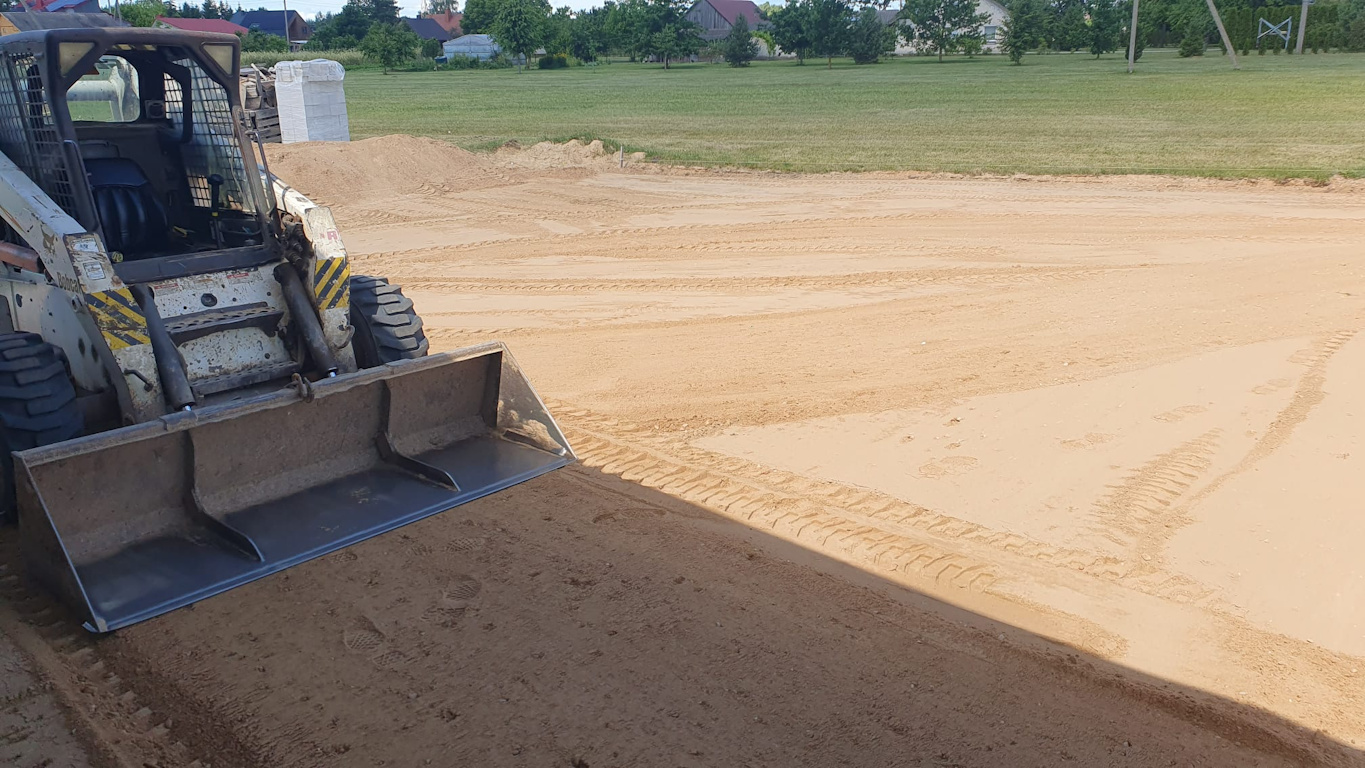 Antro etapo metu supiltas pagal STR nuostatas rekomanduojamas karjerinio smėlio sluoksnis. Tolygiai paskleistas smėlis išlygintas Bobcat S250 krautuvu.